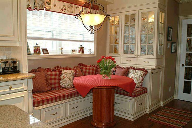 I confess to being a lover of red and there is so much to like about this bench seat area. I’m not wild about the table, but everything else is appealing.
