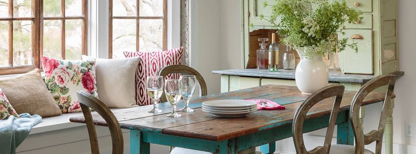 A simple bench seat, but color plays such a large part in what makes it so inviting. Eclectic and Country. Comfortable and Casual.